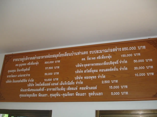 การพัฒนาที่ยั่งยืน - วันพฤหัสบดีที่ 5 กุมภาพันธ์ 2552 บริษัท เกลือพิมาย จำกัด โดย ดร.บุญทรง ศรีเฟื่องฟุ้ง ประธานกรรมการ และผู้ให้การสนับสนุน บริจาคอาคารห้องสมุด ให้แก่ โรงเรียนบ้านท่าแดง อ.พิมาย จ.นครราชสีมา