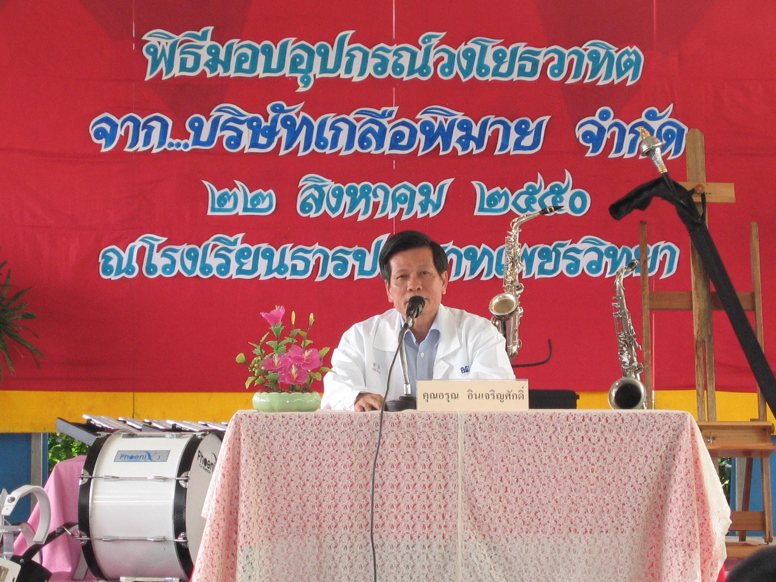 กิจกรรมเพื่อชุมชนและสังคม - วันพุธที่ 22 สิงหาคม 2550 บริษัท เกลือพิมาย จำกัด บริจาคอุปกรณ์วงโยธวาธิตให้แก่โรงเรียนธารปราสาทเพชรวิทยา